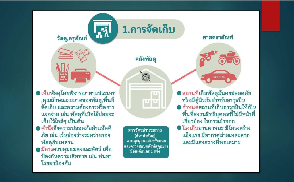 1.จำแนกประเภททรัพย์สินของทางราชการ อาวุธยุทภัณฑ์ และของบริจาค2.กำหนดแนวทางควบคุม กำกับดูแลรักษา ตรวจนับ ตรวจสอบสภาพการใช้งานทรัพย์สินของราชการ ของบริจาคโดยเฉพาะทรัพย์ประเภทที่มีความเสี่ยงในการนำไปใช้โดยมิชอบ